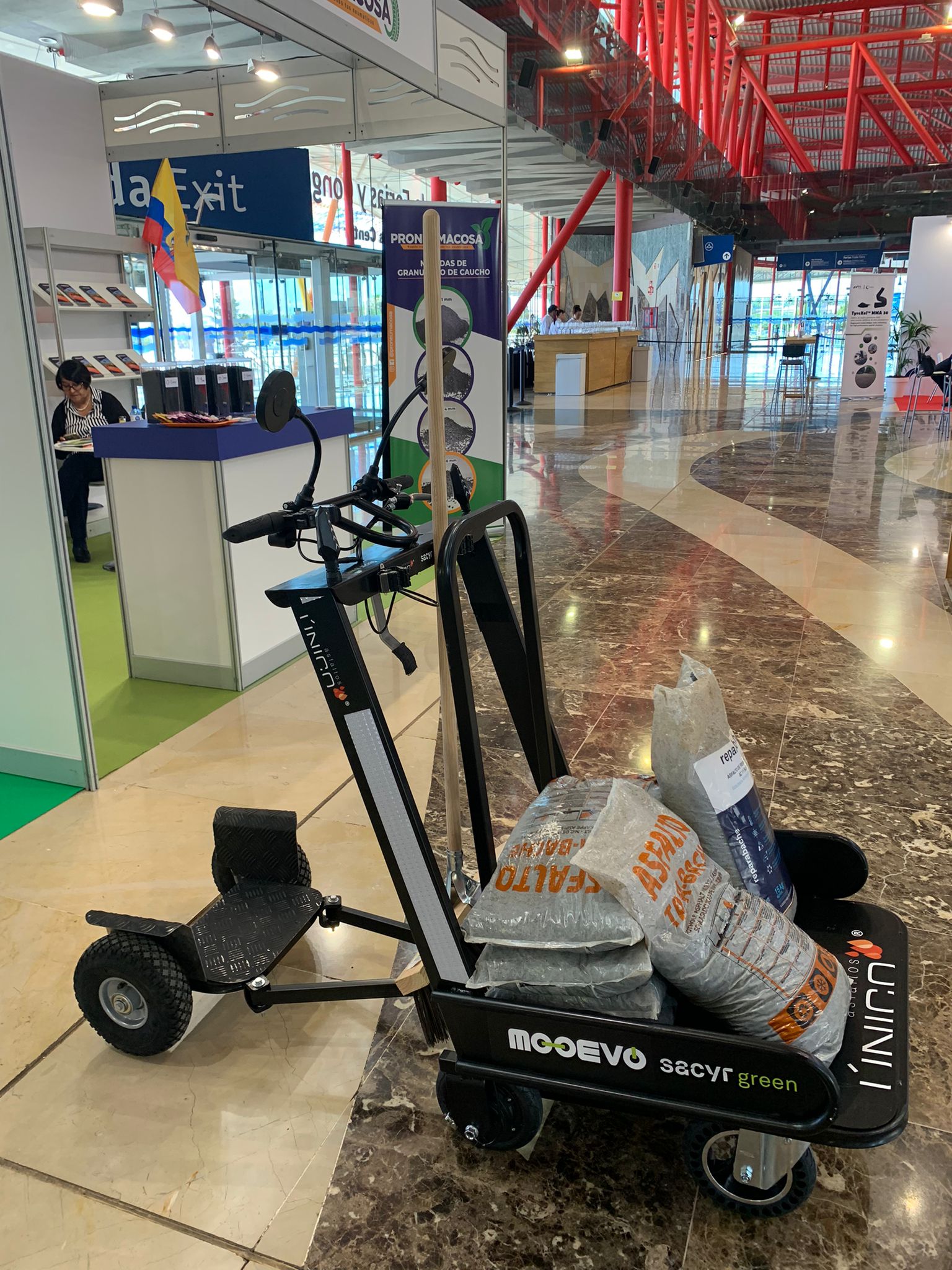 Patin electrico para reparacion de asfalto que ayuda a transportar materiales y sirve de transporte al operario o reparadores.